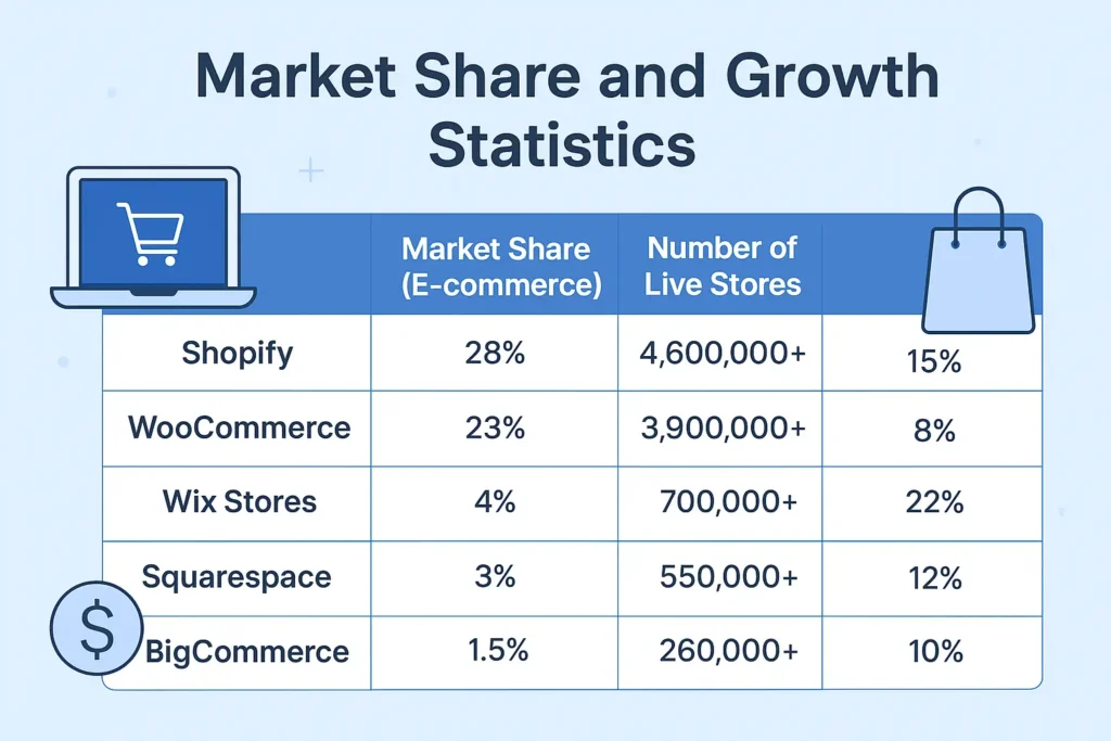 | Platform | Market Share (E-commerce) | Number of Live Stores | Year-over-Year Growth |